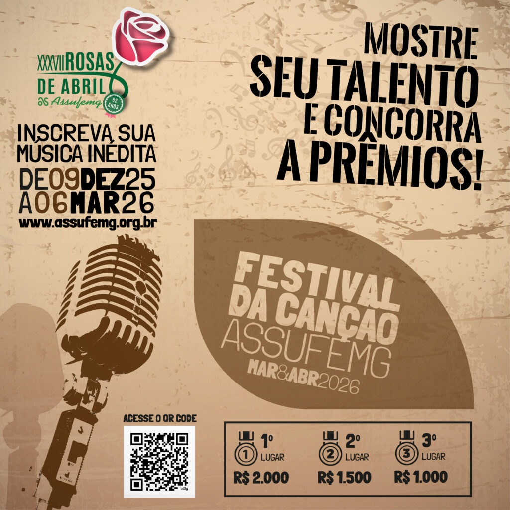 A Assufemg inicia as inscrições para o 15º Festival da Canção, um dos eventos mais tradicionais e aguardados do XXXVII Rosas de Abril, que celebra em 2026 mais um ano de incentivo à cultura, ao esporte e ao lazer. A iniciativa busca revelar novos talentos, estimular a expressão artística e oferecer palco para compositores e intérpretes da comunidade da UFMG.