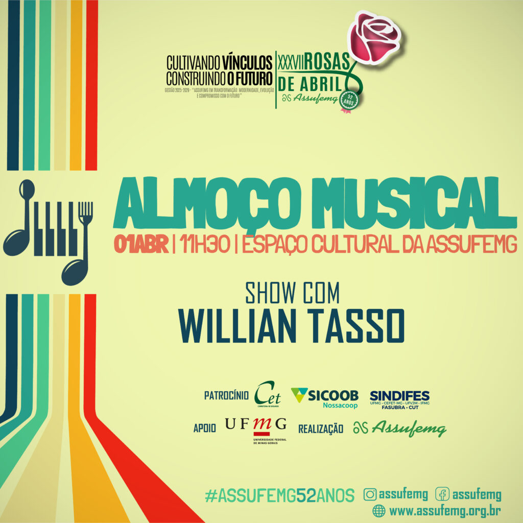 E, a partir das 11h30, o convite é para um momento especial no Espaço Cultural da Assufemg: o tradicional Almoço Musical. A Cantina Pelego’s prepara um almoço especial, enquanto o cantor William Tasso embala o público com grandes sucessos da música, garantindo um ambiente descontraído e acolhedor.
