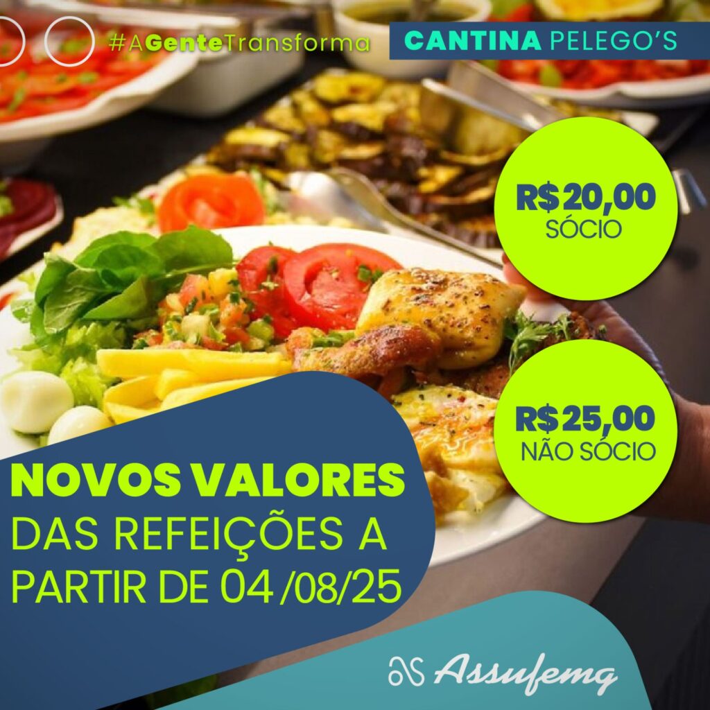 A Assufemg informa que, desde o dia 04 de agosto, os valores das refeições servidas na Cantina Pelego’s foram reajustados. A medida foi adotada em razão dos aumentos significativos nos custos que impactam diretamente a composição dos pratos oferecidos.