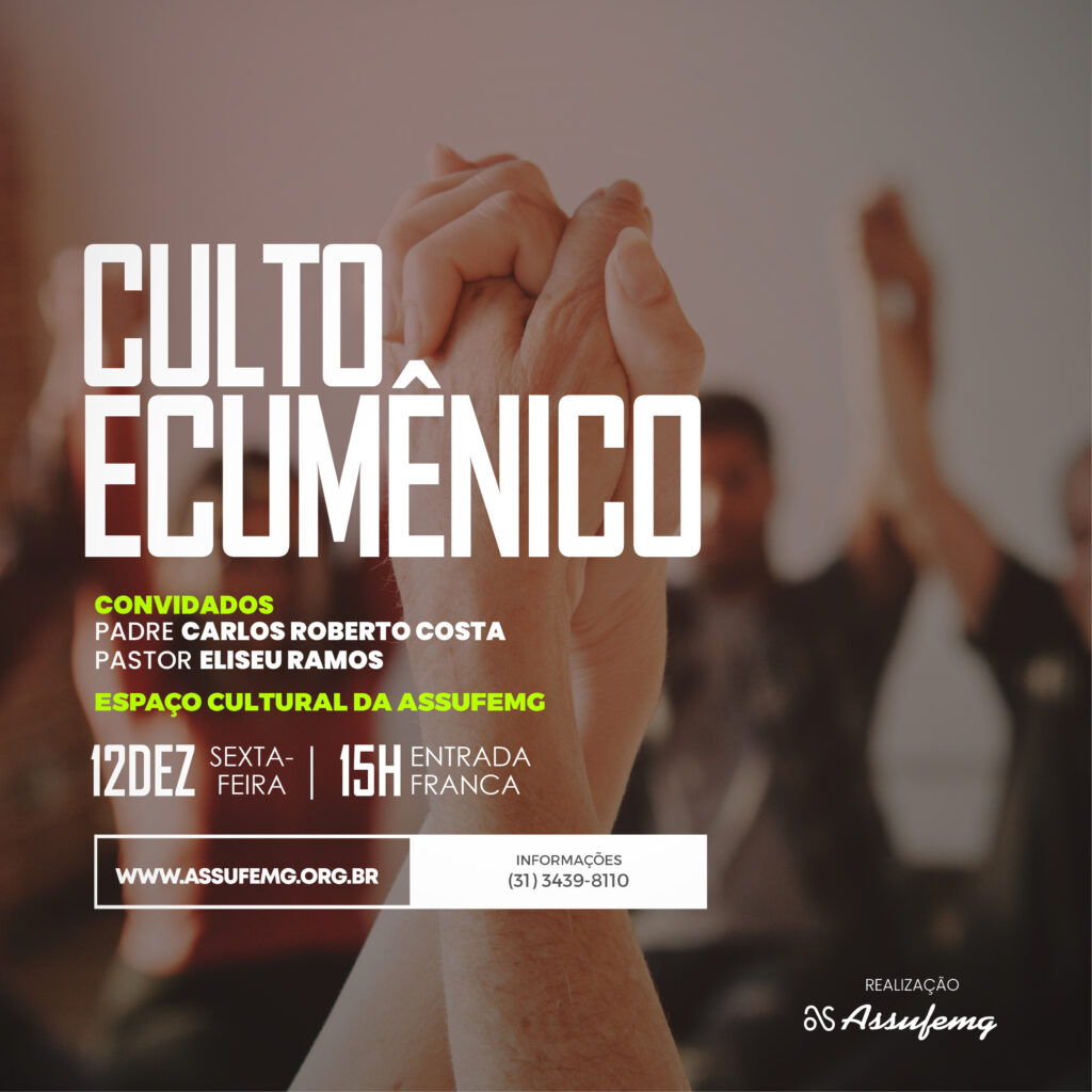 A Assufemg realizará, no dia 12 de dezembro, às 15h, o tradicional Culto Ecumênico, no Espaço Cultural da entidade. O encontro, que já faz parte da agenda oficial da instituição, reúne associados, familiares e convidados em um momento especial de reflexão, espiritualidade e celebração coletiva.