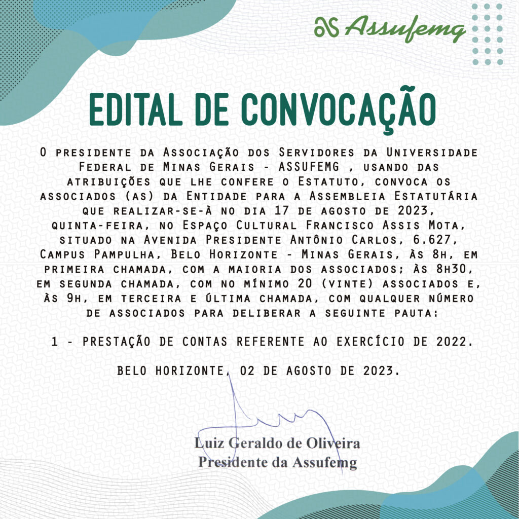 Presidente da Assufemg, Luiz Geraldo de Oliveira, convoca associados (as) para a Assembleia Estatutária, que irá deliberar sobre a Prestação de Contas referente ao exercício de 2022.