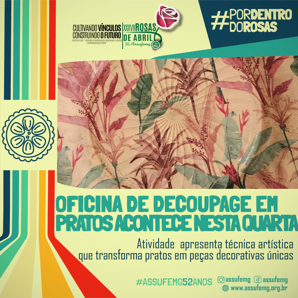 A programação do XXXVII Rosas de Abril segue valorizando a arte e a criatividade com a realização da Oficina de Decoupage em Pratos, que acontece nesta quarta-feira, 15 de abril, na Sede da Assufemg, das 14h às 16h.