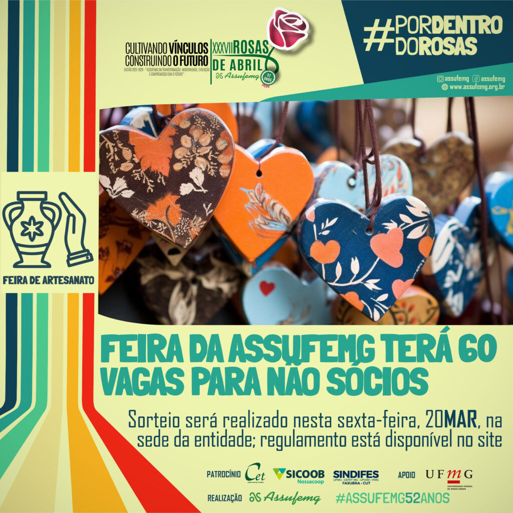 A Assufemg abre oportunidade para novos talentos participarem de uma das atividades mais tradicionais do calendário cultural da entidade. Nesta sexta-feira, 20 de março, será realizado o sorteio de 60 vagas destinadas a não sócios para a Feira de Artesanato do XXXVII Rosas de Abril.
