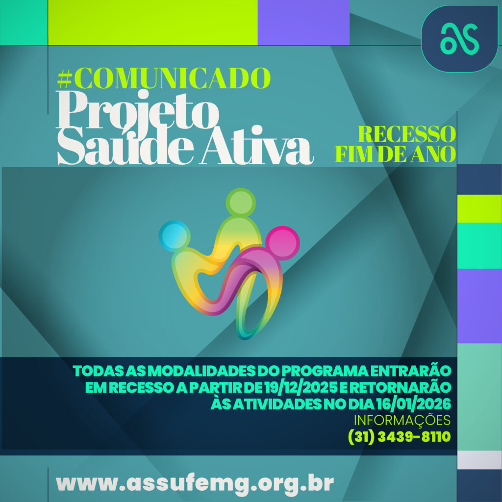 A Assufemg informa que o Projeto Saúde Ativa entrará em recesso no próximo dia 19 de dezembro de 2025, sexta-feira. A pausa abrangerá todas as modalidades oferecidas pelo programa, que só retornarão às suas atividades regulares em 16 de janeiro de 2026, sexta-feira.