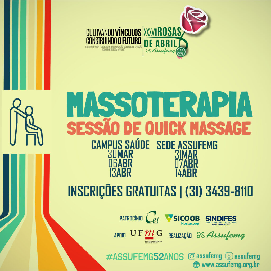 Entre as diversas atividades voltadas à qualidade de vida no XXXVII Rosas de Abril, a Sessão de Massoterapia se destaca como uma excelente oportunidade para quem busca relaxamento e cuidado com a saúde física e mental.