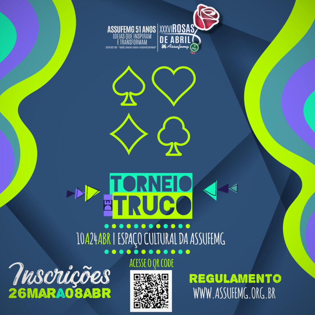 SEIS, SÔ! A Assufemg promove mais uma edição do tradicional Torneio de Truco do XXXVI Rosas de Abril. O evento, que celebra a união e o espírito esportivo da comunidade acadêmica, ocorrerá entre os dias 10 e 24 de abril, a partir das 17h, no Espaço Cultural da Assufemg.